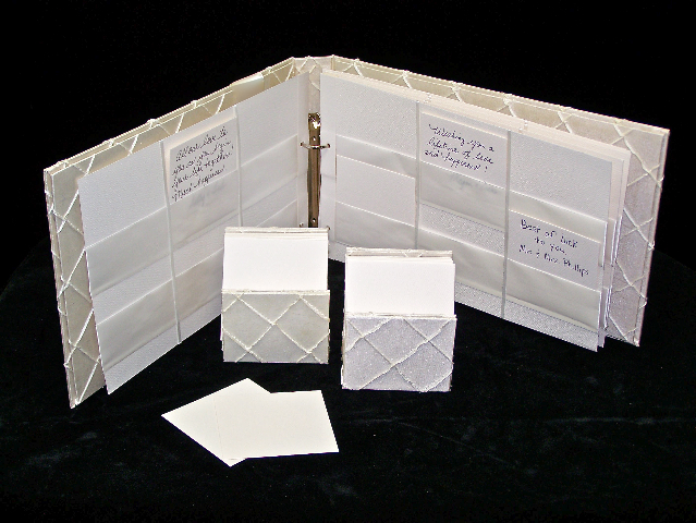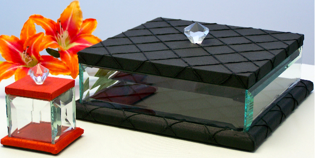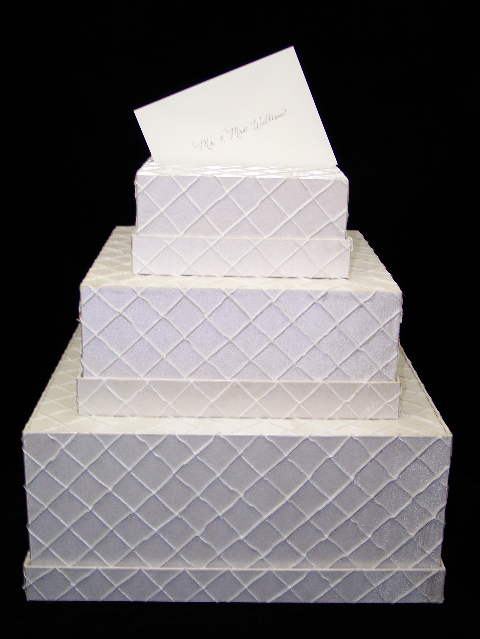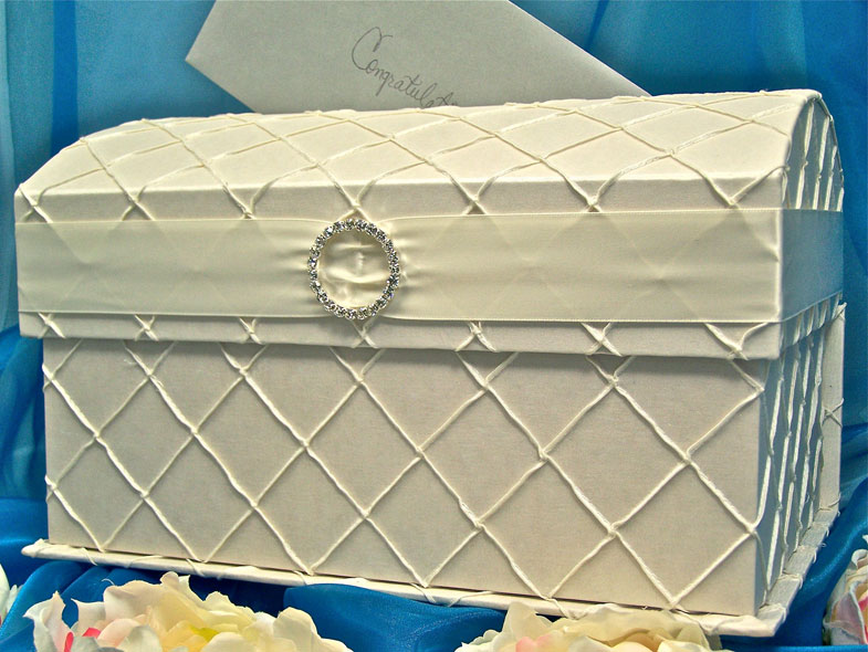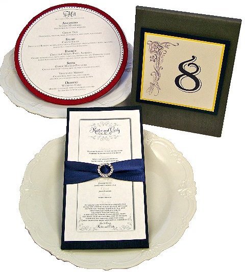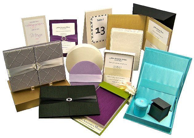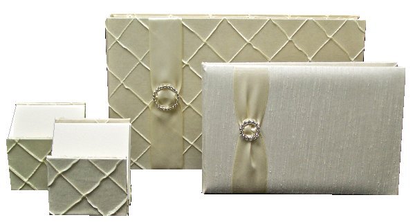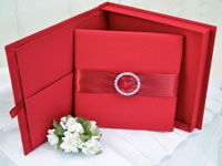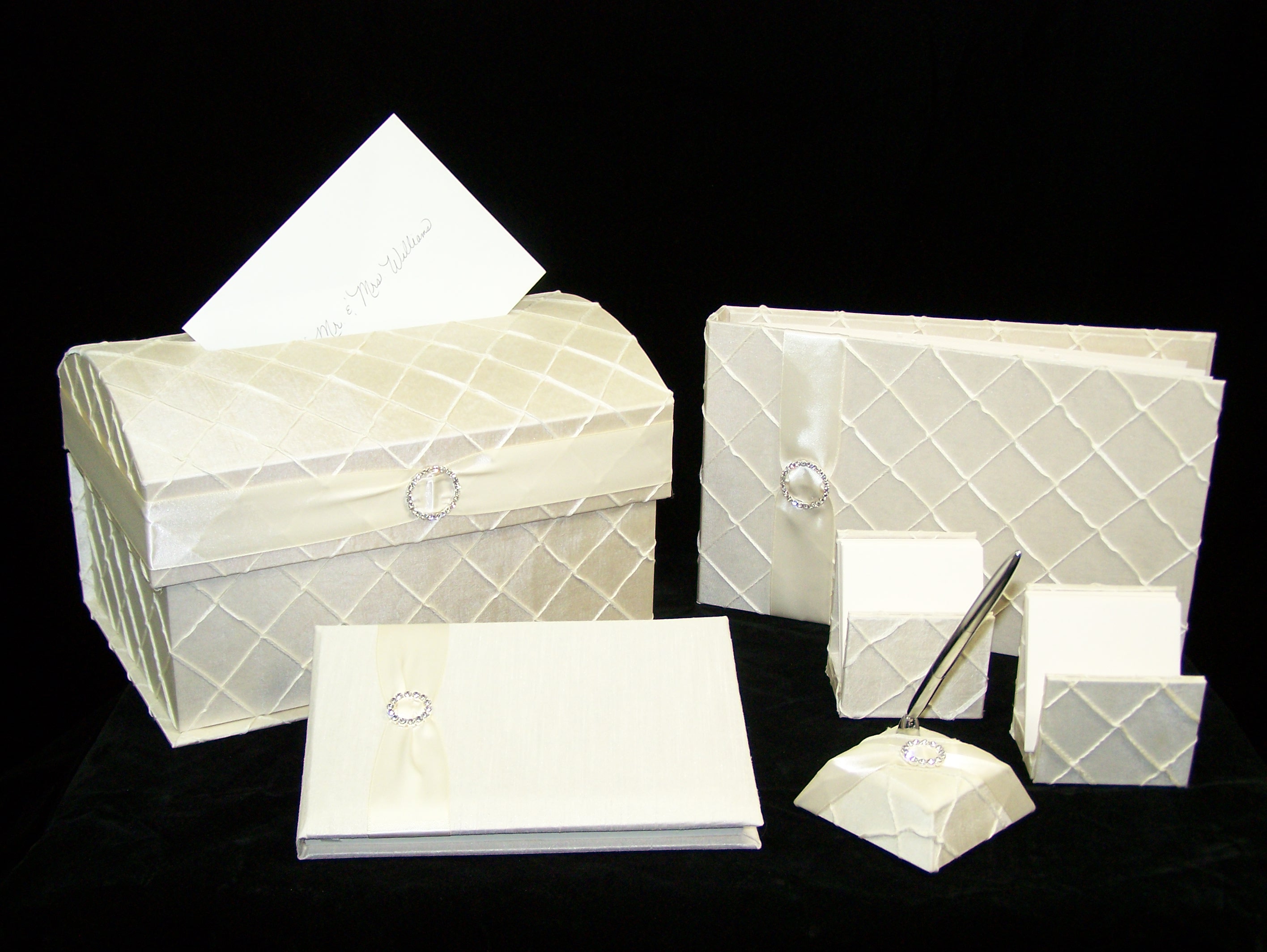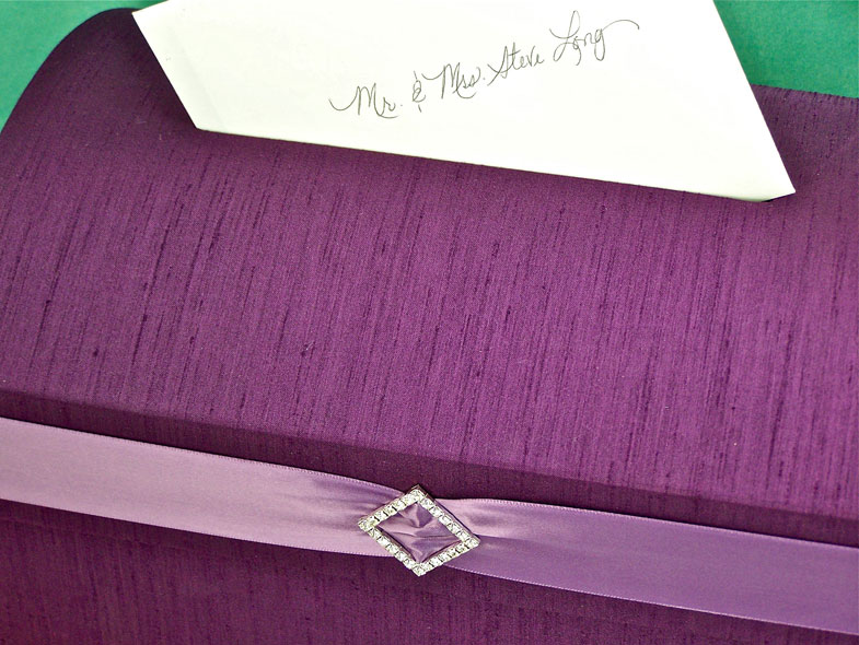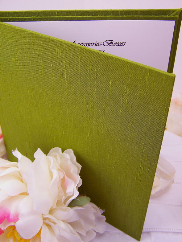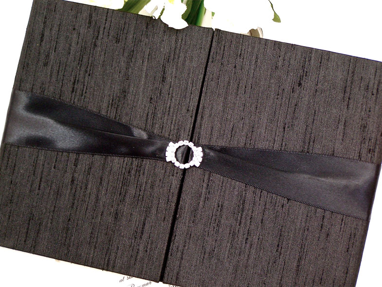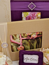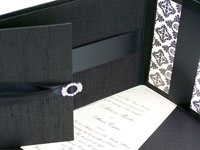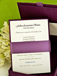 Upscale invitation Folios–Accessories–Boxes make lasting "first impressions" and set the tone for a very special occasion. All are handmade to order, using luxurious in stock poly dupioni silk, pintuck and satin fabric and ribbons. Create distinctive looks with jeweled embellishments and two-tone color mixing.